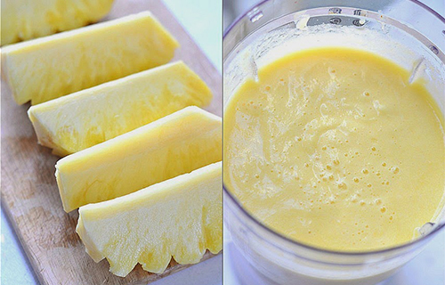 - Dứa mua về đem rửa sạch, gọt bỏ vỏ, cắt mắt và lấy 1 miếng đem xay nhuyễn. Rồi lấy rây lọc tách riêng phần bã và nước ép.